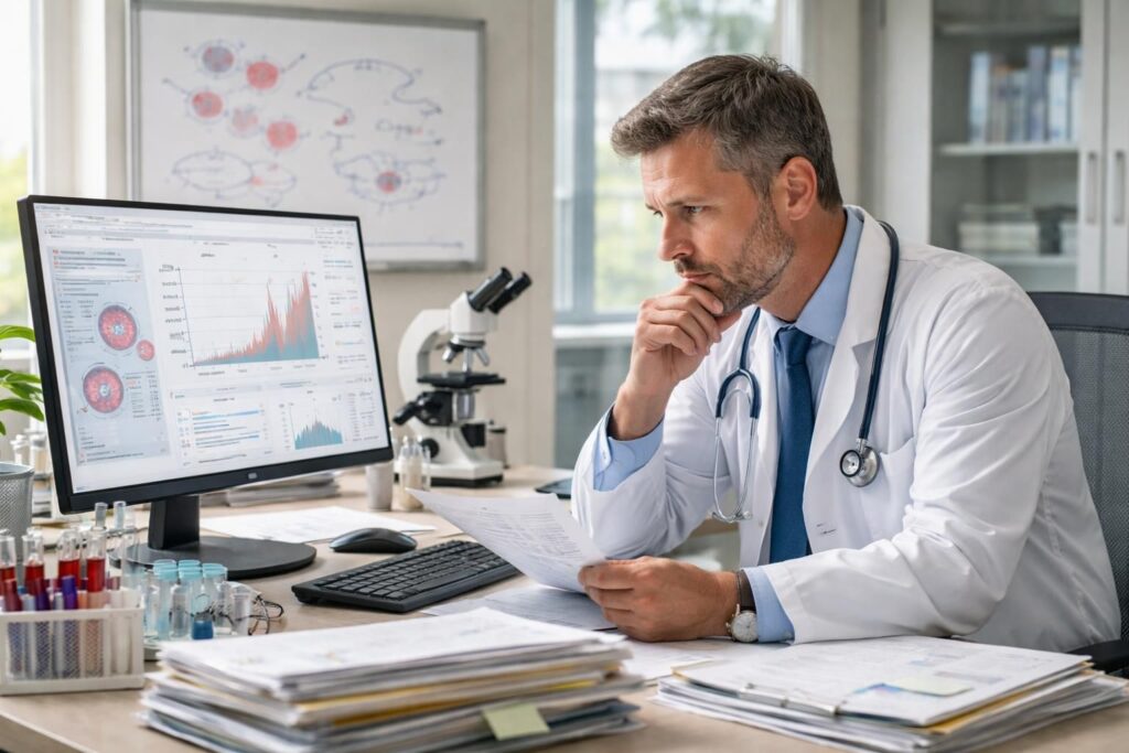La gestion de ces faux positifs nécessite une attention particulière. Les cliniciens doivent sensibiliser les patient(e)s aux situations pouvant entraver la précision des résultats. En effet, un patient déshydraté ou ayant subi une chirurgie récente peut montrer des niveaux de plaquettes augmentés sans qu’il y ait une pathologie sous-jacente. Concrètement, avant de se précipiter vers un diagnostic alarmant, des vérifications doivent être effectuées, comme la répétition de l’analyse sanguine dans des conditions appropriées, de préférence lors d’une semaine biologique stable.
